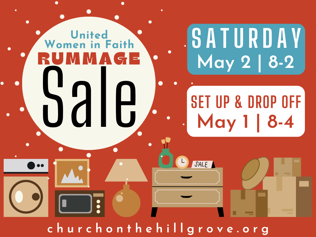 The semi-annual Rummage Sale is May 2 from 8am-2pm in the West Wing. This is a fundraiser for the United Women in Faith. All funds raised will help support local and global missions, as well as provide scholarships for local seniors.